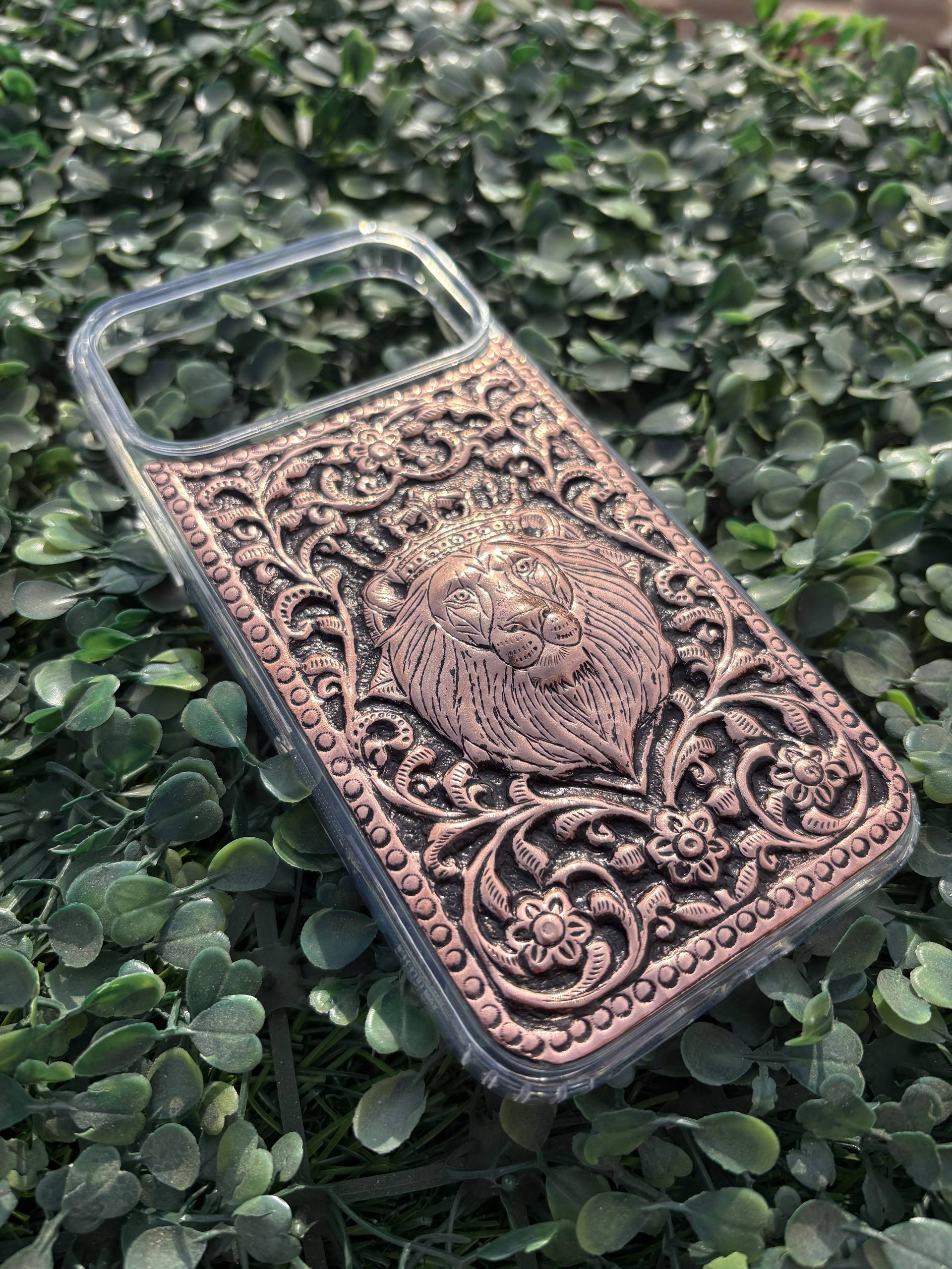 Lion Engraved Copper Mobile Cover