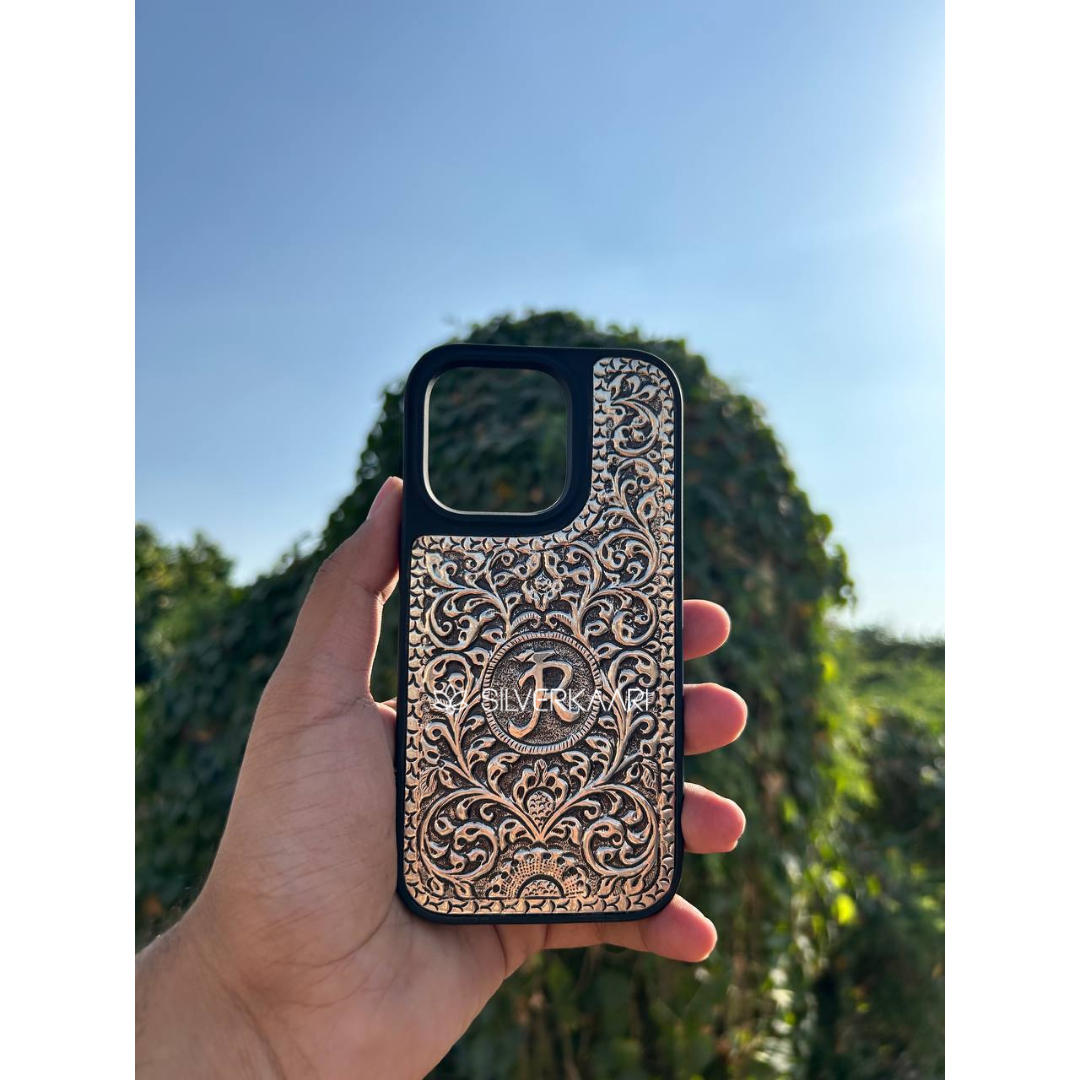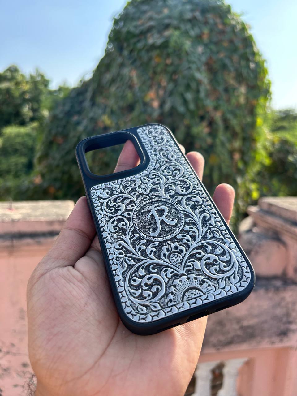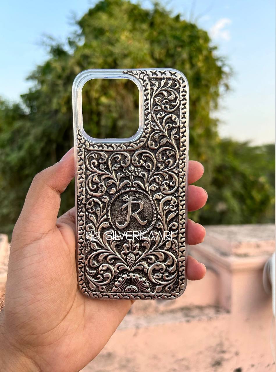 Embrace elegance with this intricately designed silver case, featuring a personalized monogram and ornate detailing. A perfect blend of luxury and craftsmanship for your device.