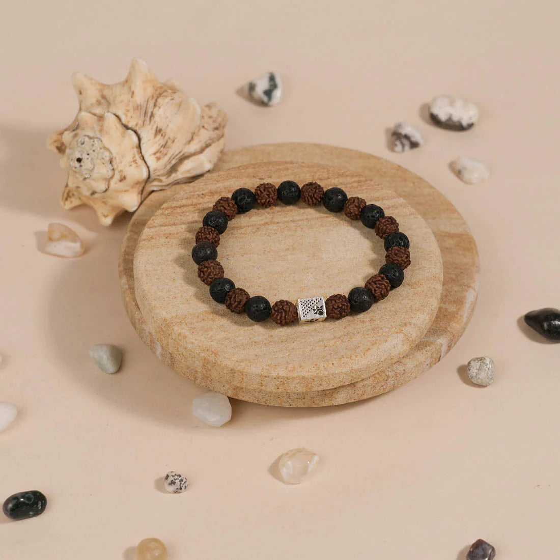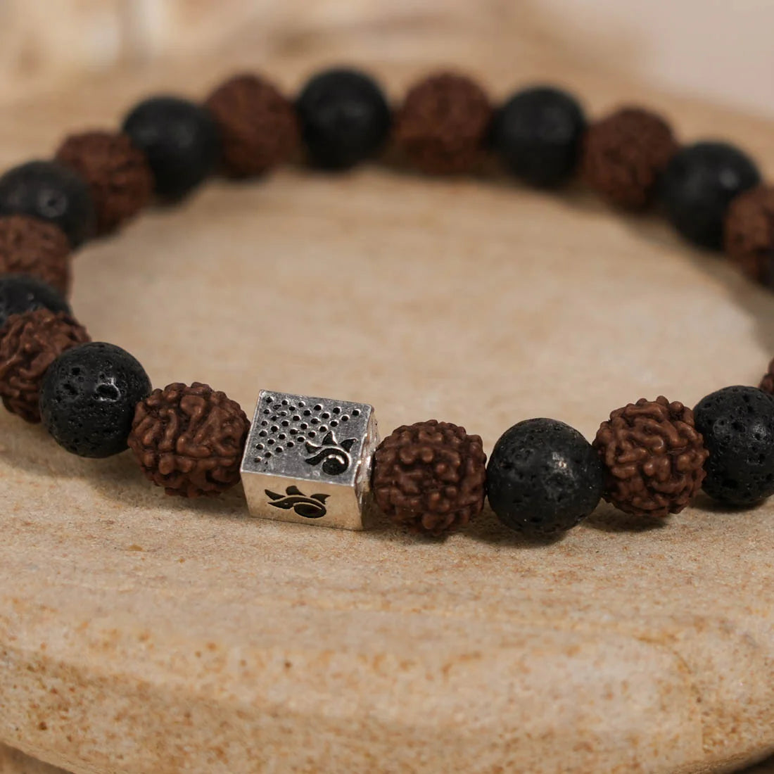 - Design: Rudraksha beads for spiritual energy, Lava stones for grounding, and a silver Om bead for divine vibrations.