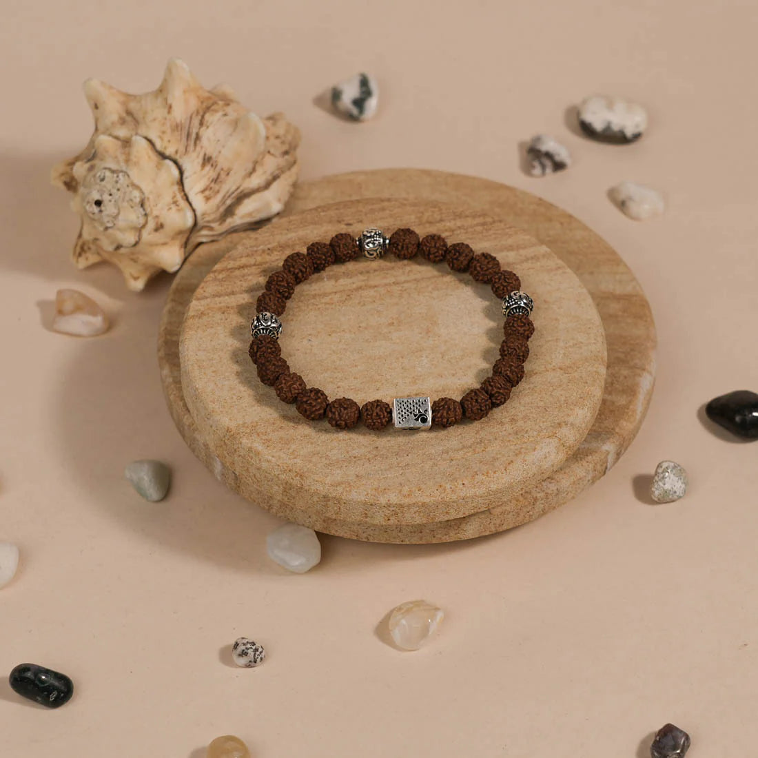 - Design: Stretchable bracelet with sacred Om-engraved silver beads