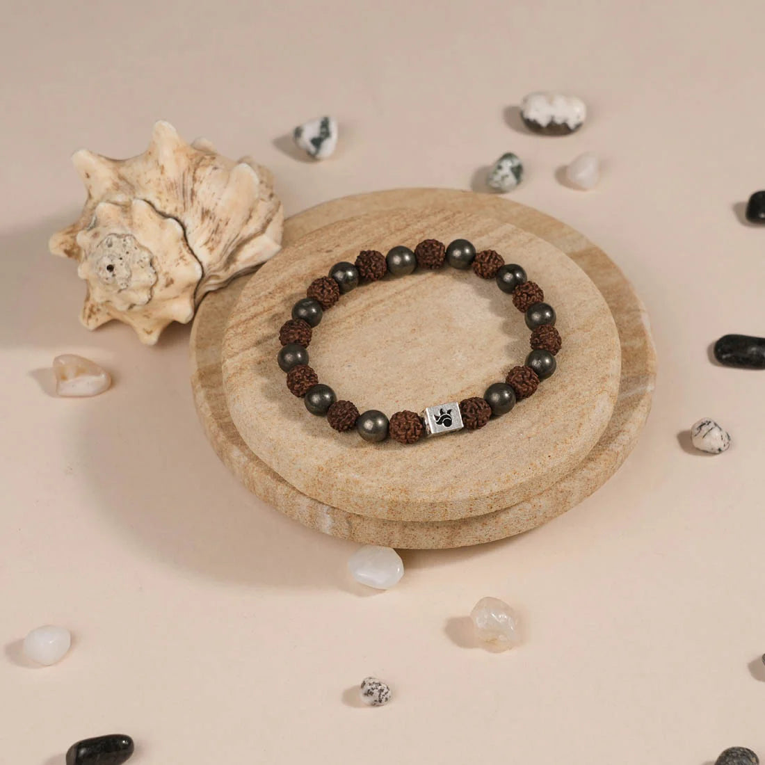 - Design: Stylish combination of sacred Rudraksha, metallic Pyrite stones, and a silver Om cube bead
