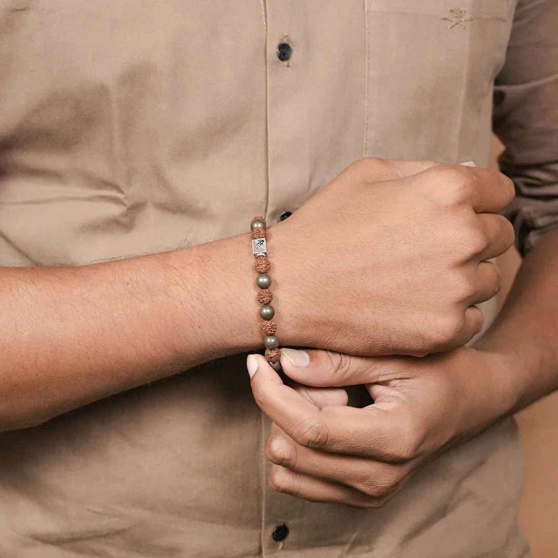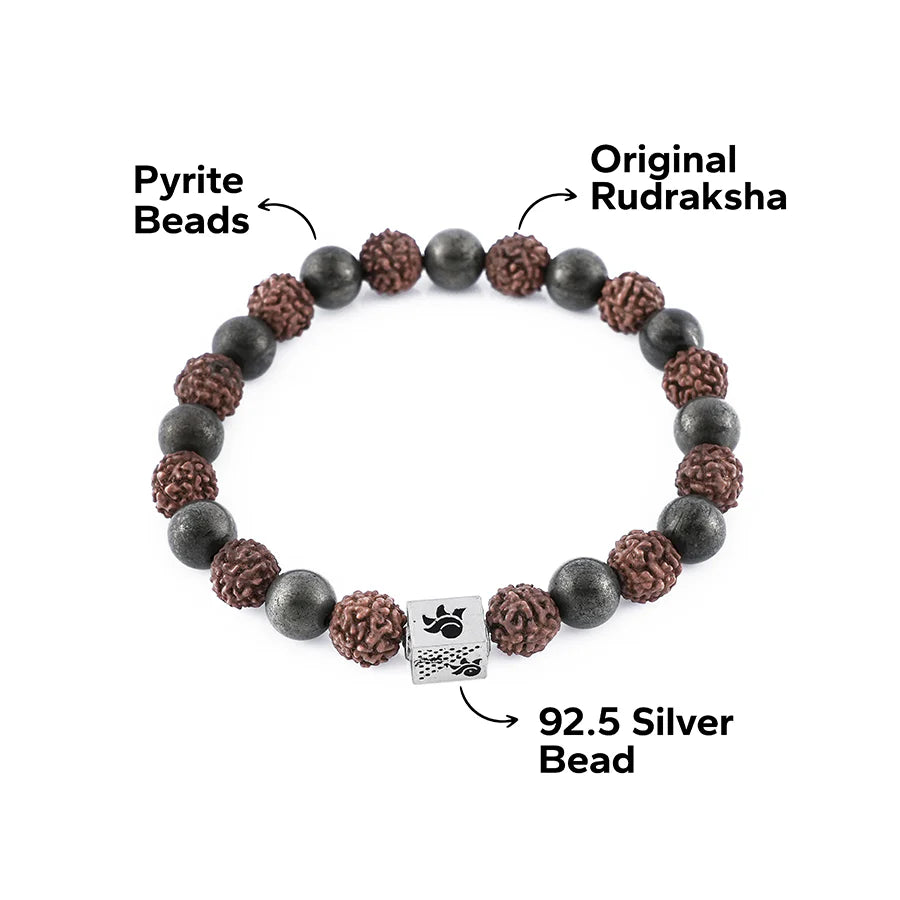 - Material: 5 Mukhi Rudraksha Beads + Pyrite Stones + 92.5 Silver Om Bead
